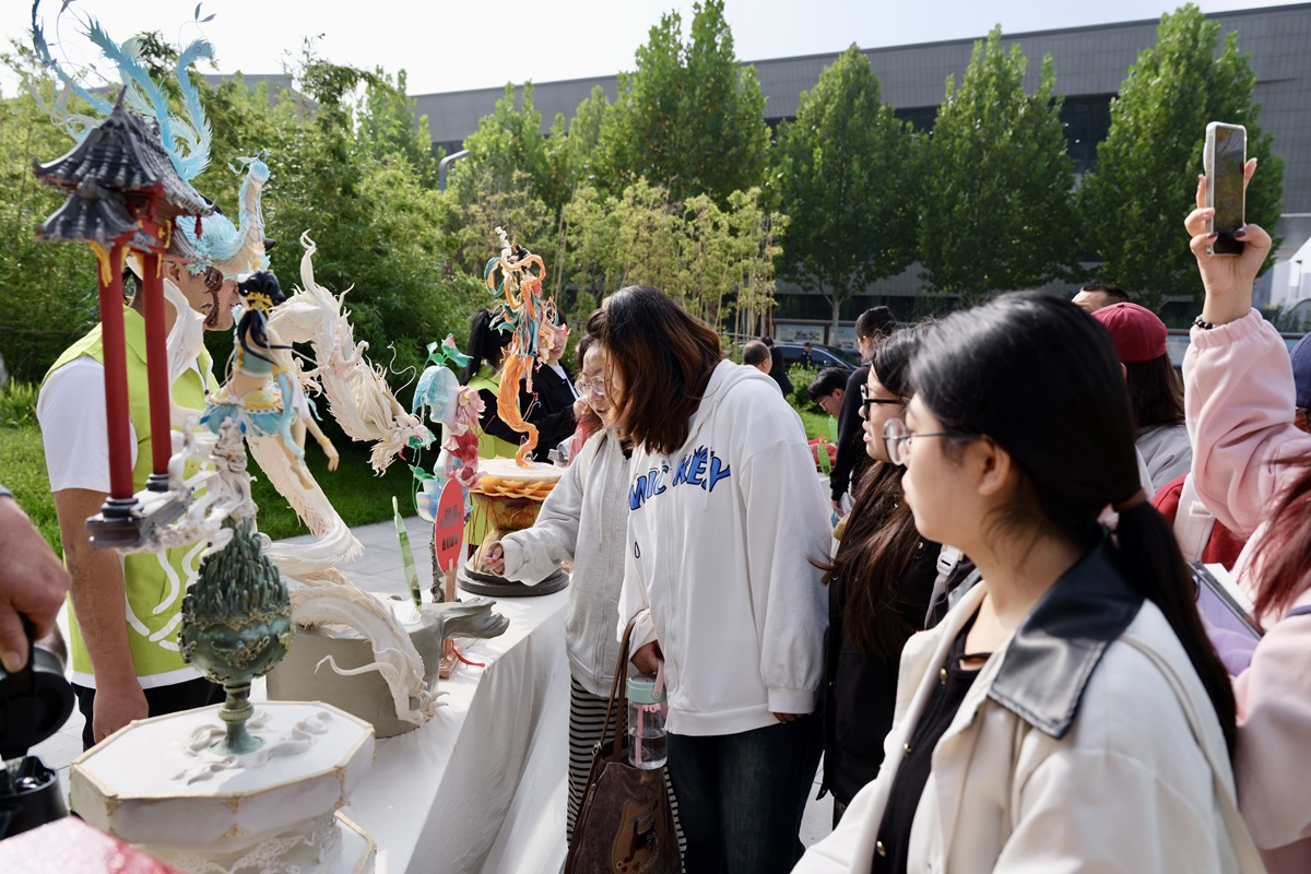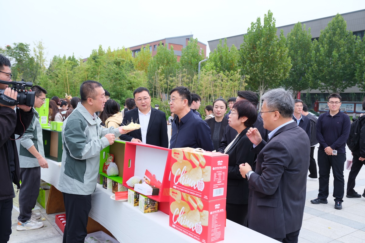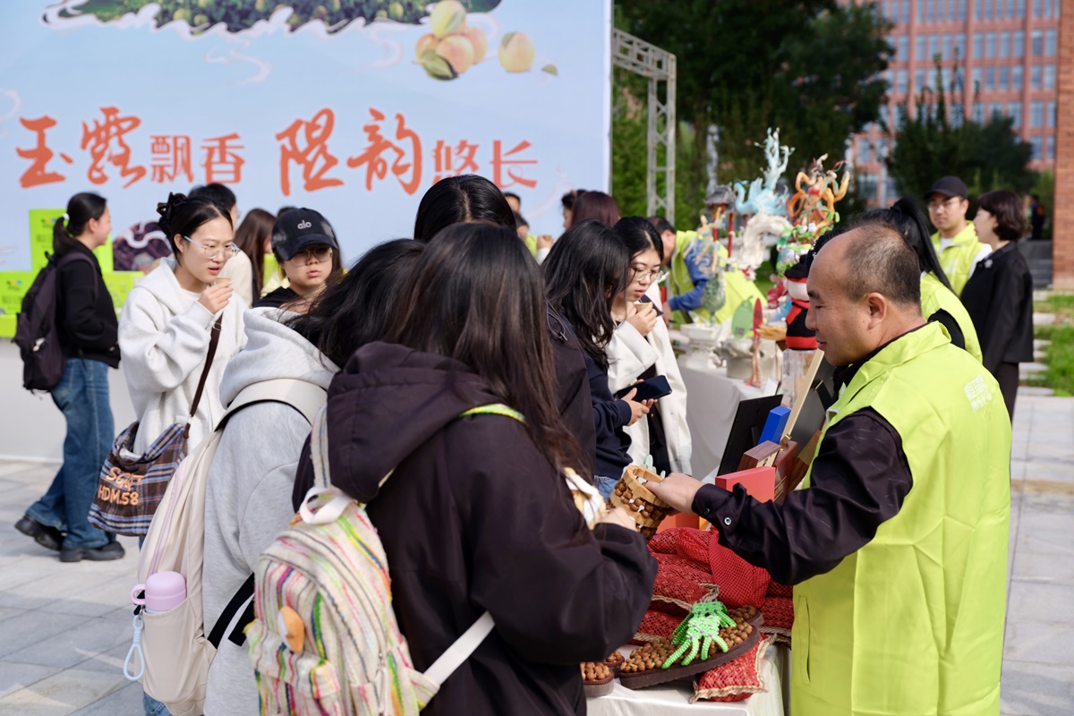 与此同时,隰县非遗与农特产品展示活动也在校园里同步进行。面塑、手工钩织技艺、山桃核手工编织、剪纸等琳琅满目的非遗工艺品和以隰县玉露香梨为代表的地方特色农产品,吸引了过往师生纷纷驻足观看、品鉴,零距离、多维度地展现了隰县深厚的历史文化底蕴与物产风貌,为后续的深度合作营造了浓厚氛围。