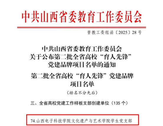 近日,从省委教育工委传来喜讯,我校文化遗产与艺术学院学生党支部凭借扎实的党建基础和鲜明的育人特色,成功入选全省第二批高校“育人先锋”党建品牌中“全省高校党建工作样板支部”创建单位。这是我校建校以来首次获得该项省级党建品牌创建资格,标志着学校党建工作实现“零的突破”,正式迈入全省高校党建工作先进行列,登上新的发展台阶。