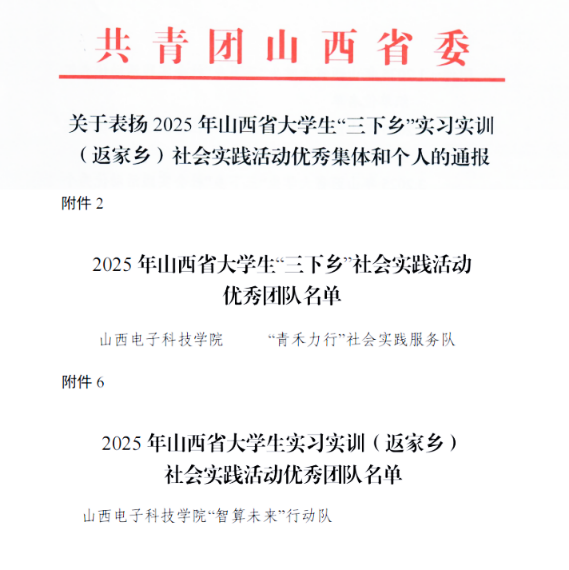 近日,共青团山西省委正式印发《关于表扬2025年山西省大学生“三下乡”实习实训(返家乡)社会实践活动优秀集体和个人的通报》,我校学生社团联合会和“第二课堂成绩单”管理中心联合组建的“青禾力行”社会实践服务队,凭借深耕基层的务实作风与亮眼成果,获评“2025年山西省大学生‘三下乡’社会实践活动优秀团队”;计算机科学与技术学院组建的“智算未来”行动队,以科技赋能地方发展的创新实践,荣获“2025年山西省大学生实习实训(返家乡)社会实践活动优秀团队”。