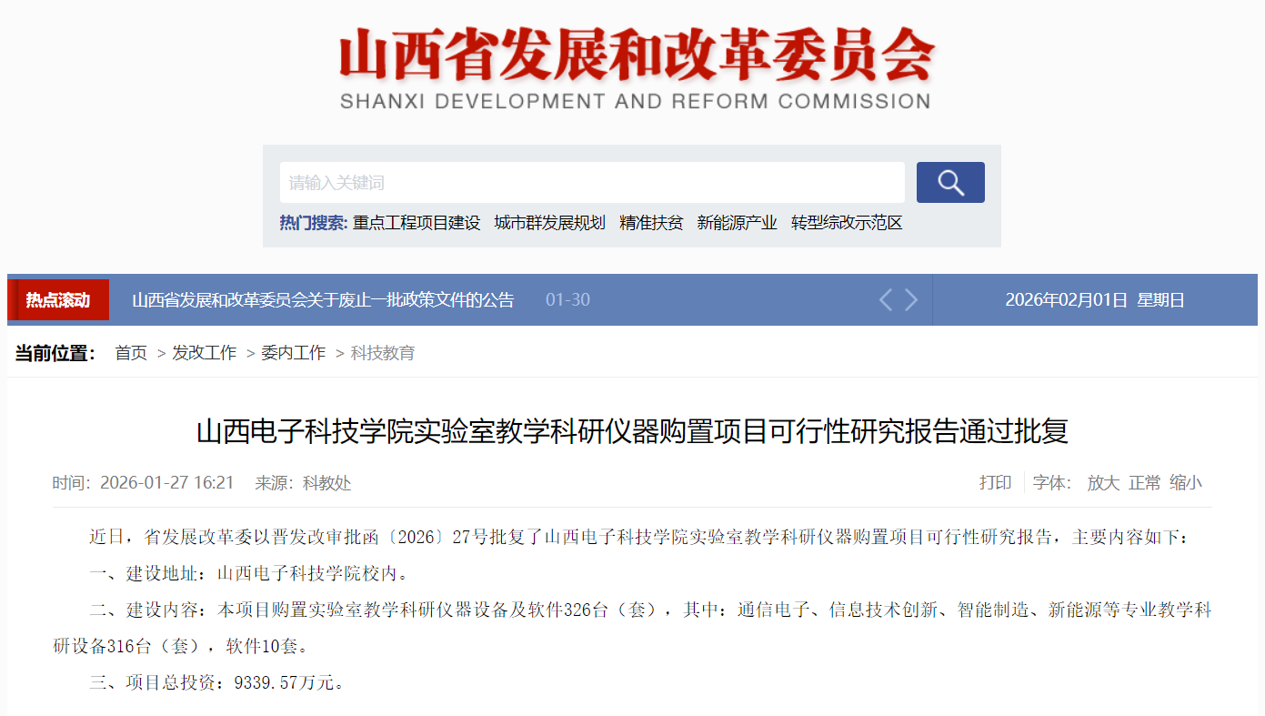 近日,省发展改革委以晋发改审批函〔2026〕27号批复了山西电子科技学院实验室教学科研仪器购置项目可行性研究报告,主要内容如下: