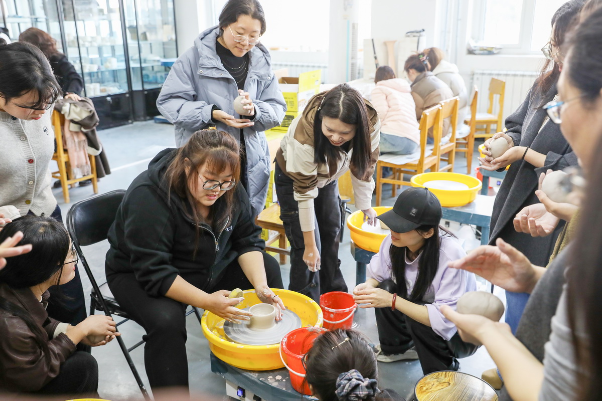 活动现场氛围温馨雅致、其乐融融。在15A-103陶艺体验教室,专业老师刘雨鑫细致讲解陶土特性、捏塑技巧与塑形要点,女教职工们兴致勃勃、动手实践,揉泥、塑形、修坯……指尖轻捻间,一件件质朴灵动的茶杯、花瓶、创意摆件初具雏形。大家在沉浸式手工创作中舒缓压力、陶冶情操,期待着作品烧制完成后的专属惊喜。