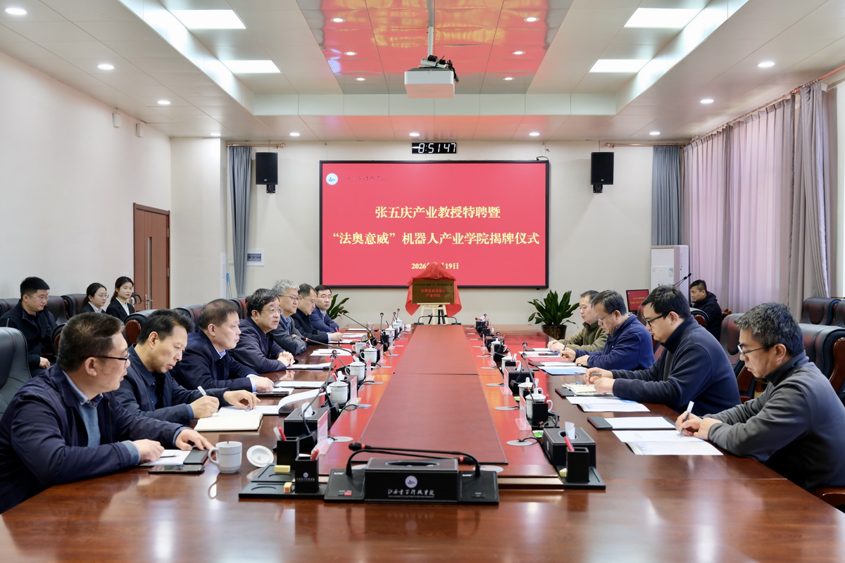 3月19日上午,张五庆产业教授特聘暨“法奥意威”机器人产业学院揭牌仪式在我校17号楼一层会议室举行。校党委书记扈新起,党委副书记、校长任利成,党委委员、副校长杨正民,副校长孙桓五出席仪式。智能制造领域资深专家、高级工程师张五庆教授,法奥意威机器人有限公司副总经理陈宇恒,苏州友达光电集团达智慧科技有限公司经理虞斌,中国电子集团鹏程智能装备股份公司副总经理古长均应邀出席。学校人才工作部部长邢平伟、科研与对外合作部负责人张鹏、智能制造工程学院负责人赵春江及教师代表共同见证这一重要时刻。