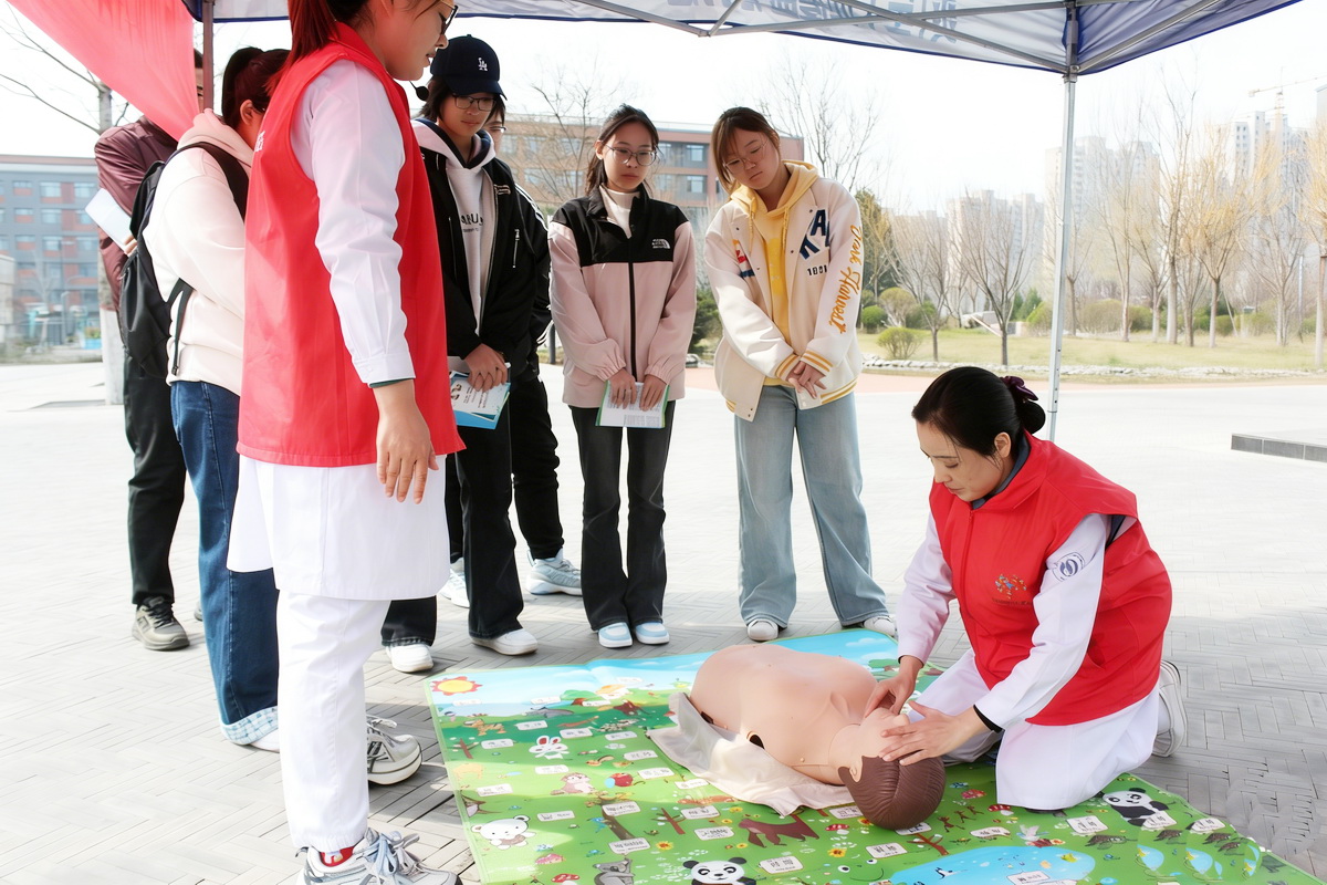 在结核病防治专区,感染科、内科专家通过科普展板、宣传手册,向师生详细讲解结核病的传播途径、早期症状、规范治疗流程及国家免费救治政策,重点强调“咳嗽咳痰超两周需及时就诊”的健康警示,引导师生养成勤通风、戴口罩、不随地吐痰的良好卫生习惯。感科专家围绕校园环境消毒、手卫生规范等内容进行现场演示,助力筑牢校园防疫安全屏障。在应急技能培训区,心肺复苏急救团队通过模拟人现场实操演示,手把手教授师生胸外按压、人工呼吸等急救技能,讲解气道异物梗阻、突发晕厥等常见急症处置要点,让师生在实践中掌握“黄金4分钟”急救知识,切实提升校园应急自救互救能力。