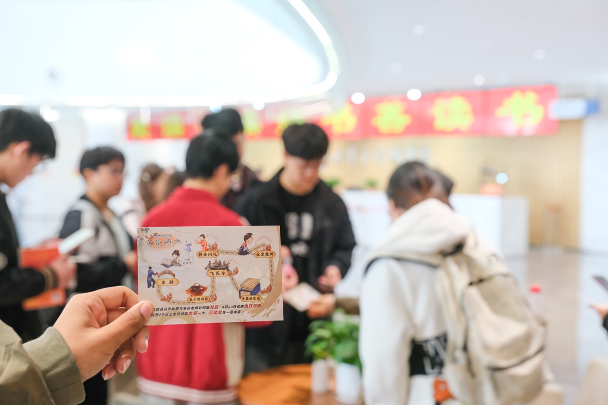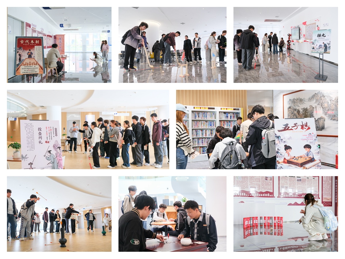 读书日当天,活动现场暖意融融、书香氤氲,“阅古知今・书香闯关”传统文化游园会成为当日焦点。投壶问礼、杖定乾坤、古籍辨装帧、飞花令、五子棋对弈、木射等六大传统趣味关卡错落排布,全天精彩不打烊。师生手持闯关卡有序参与、踊跃竞逐,现场人头攒动、笑语盈盈。“投壶问礼”前,大家凝神投掷、从容答题,在传统礼仪与文学常识中感受古韵风雅;“杖定乾坤”区域活力迸发,同学们在趣味运动中探寻古代体育文化的独特魅力;“古籍辨装帧”展台前,师生认真观察平装、精装与线装书籍的工艺差异,近距离领略传统典籍的匠心之美;“飞花令”现场诗词声声、高潮迭起,围绕关键字句的对答如流尽显师生深厚书香底蕴;五子棋对弈区棋逢对手、静中有动,黑白博弈间展现思维智慧的碰撞;木射游戏前,大家奋力投掷、挑战闯关,在传统游戏中解锁礼仪典故与文化知识。每完成一关即可盖章留念,集齐印章可兑换定制奖品,众多同学全程参与、乐在其中,纷纷表示:“走出宿舍和教室参与这种沉浸式游园,既新颖有趣,又能在轻松互动中增长知识、感受传统文化魅力,让读书日变得生动而难忘。”