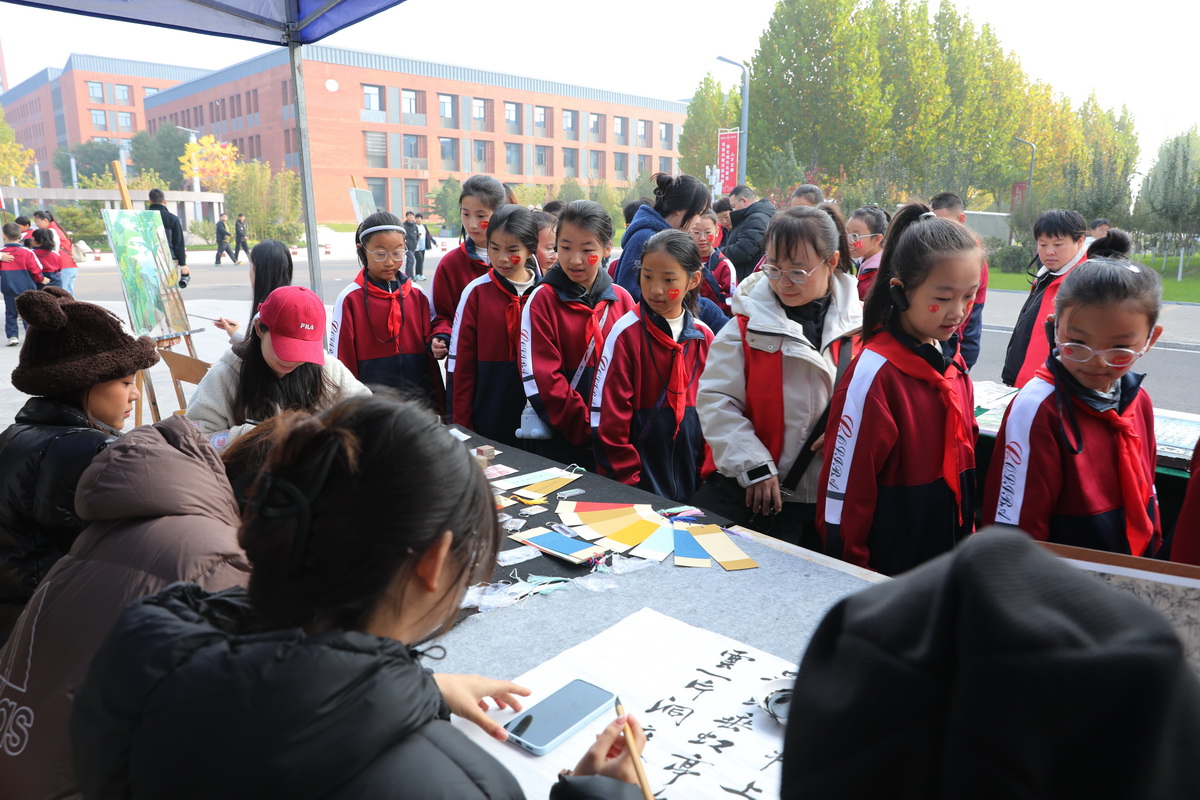小学生们身着整齐校服,在老师与家长代表的护送下徒步抵达山西电子科技学院南门。校宣传统战部联合相关部门精心设计研学路线,从“天下第一鼓”设计原型的网球中心出发,途经印园、隐秀湖、时光长廊、劝学广场等学校标志性场地,让孩子们在自然景观与人文建筑的交融中感受大学校园文化。在印园,孩子们接过文化遗产与艺术学院精心准备的励志书签,感受中华优秀传统文化魅力;劝学广场中央,面对荀子雕像与《劝学》书卷,师生共同诵读经典片段,体悟“学不可以已”的治学精神。走到图书馆前,“书卷”造型的建筑设计令孩子们惊叹不已,在专业讲解员引导下,他们体验朗读亭、了解智能借阅系统,感受“藏借阅一体化”的智慧阅读氛围。“政”青春大学生理论宣讲团以“中国电子科技的高光时刻”为主题,深情讲述我国在半导体、人工智能等领域的重大突破,以“科技兴则民族兴,科技强则国家强”的齐声呐喊点燃全场热情。