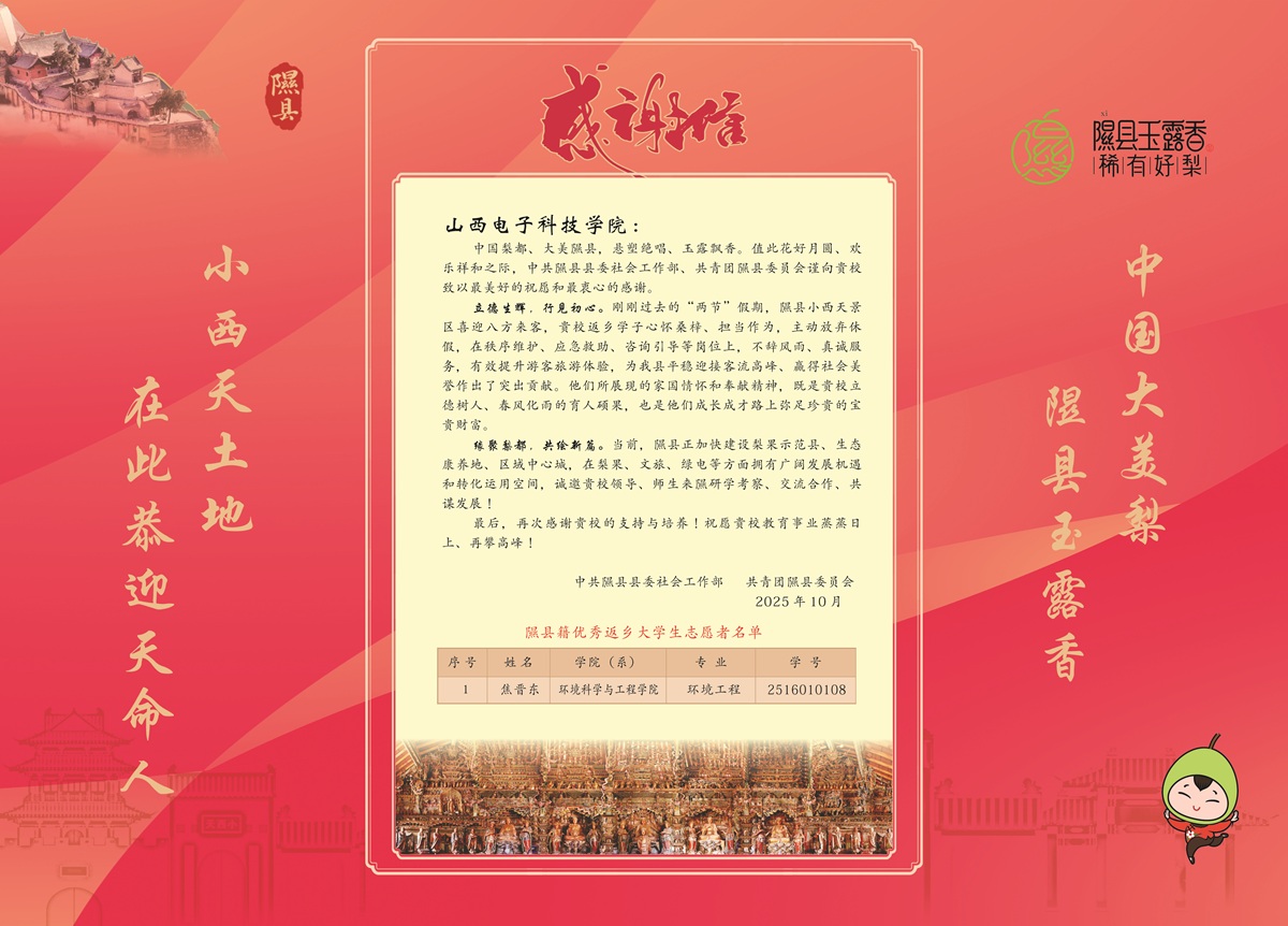 从校园课堂到社会服务现场,焦晋东用一场志愿服务,交出了一份精彩的青春答卷。他的事迹生动诠释了当代大学生的责任与使命——青春的价值,从不只在书本知识的积累里,更在走出校园、扎根社会,用脚步丈量土地温度、用双手传递温暖力量的实践中。此次获隰县致函表彰,既是对他个人的肯定,更是对我校“育人为本、德育为先”育人成果的认可,更为全校学子树立了“以实践践初心,以奉献显担当”的优秀榜样。(校团委 供稿)