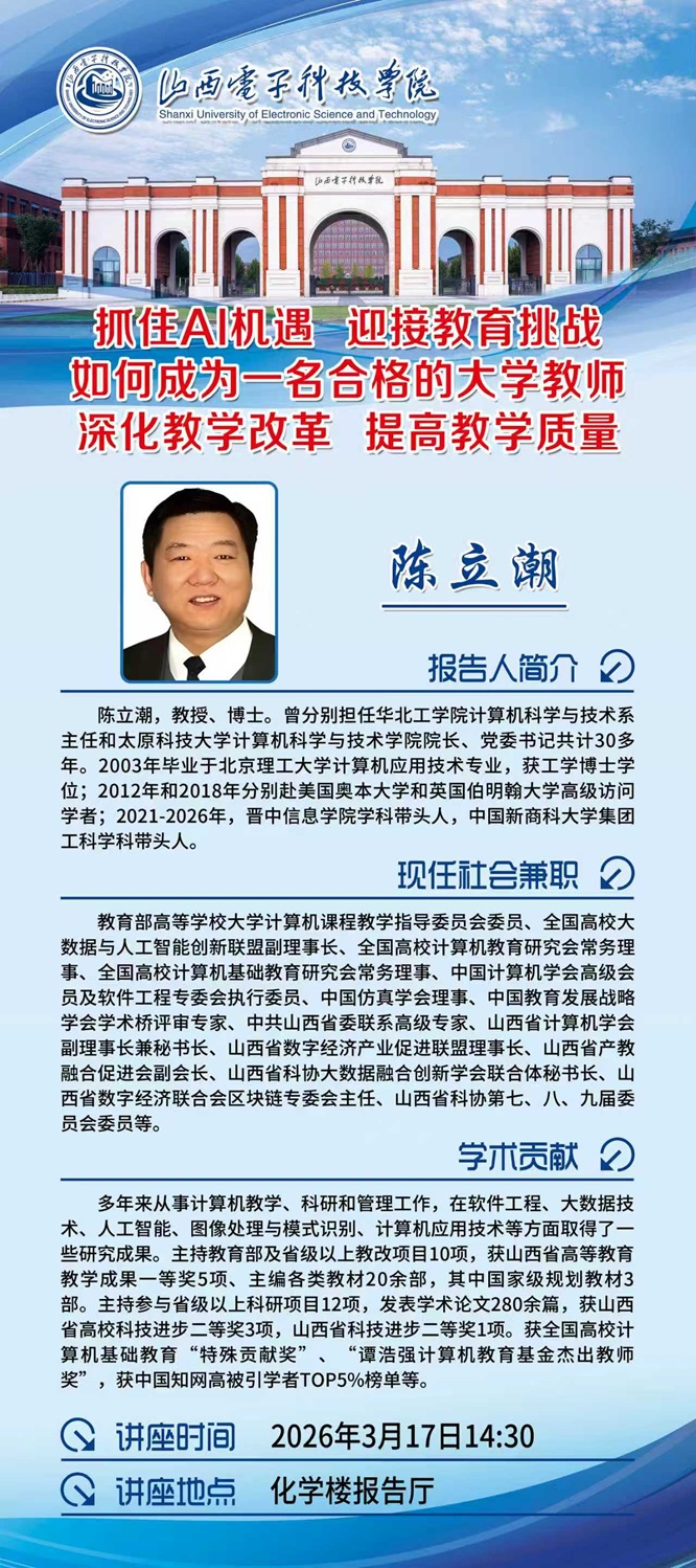 下一条: 讲座题目:与Al共舞 智造未来(报告人:华为技术有限公司核心网和云计算架构师、主任工程师潘会民)
